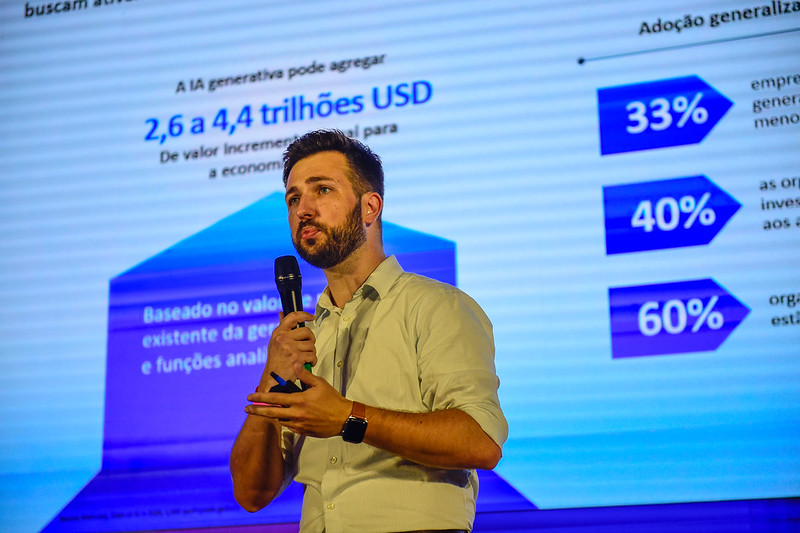 Segundo o especialista, a IA Generativa está mudando os paradigmas, embarcada em diversas soluções: facilita a tarefa, melhora a qualidade da entrega, automatiza, agiliza processos, reduz o erro, diminui significativamente o esforço e o tempo investido, que pode ser usado para atividades de alto valor, pois não é necessário começar do zero. Ele reafirma que é preciso desmistificar a IA e ficar claro que não é um inimigo do emprego, mas sim um apoio.