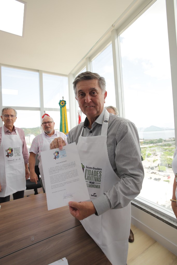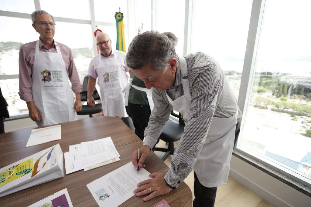 Florianópolis receberá em agosto a 1ª edição do Encontro Brasileiro das Cidades Criativas UNESCO da Gastronomia. A carta de intenções que celebra a parceria entre o Sistema Fecomércio SC Sesc Senac e a Prefeitura Municipal foi assinada nesta quarta-feira (22), véspera do aniversário da cidade, pelo prefeito Topázio Neto e o presidente do Sistema Fecomércio SC Sesc Senac, Hélio Dagnoni. Participaram do ato a coordenadora de Projetos Especiais e Relação com a Sociedade Civil da Prefeitura, Zena Becker, representantes do grupo gestor do FloripAmanhã, entidade responsável pela chancela da Unesco, e imprensa.