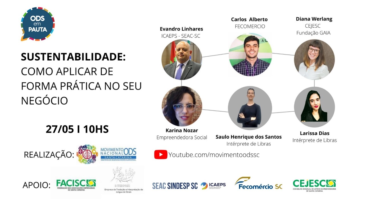 O Comitê da Grande Florianópolis do Movimento ODS promove debate online sobre sustentabilidade nos negócios e como os empresários podem implementar ações práticas no dia a dia, nesta quinta-feira (27/05), às 10h, no canal do Movimento no Youtube.